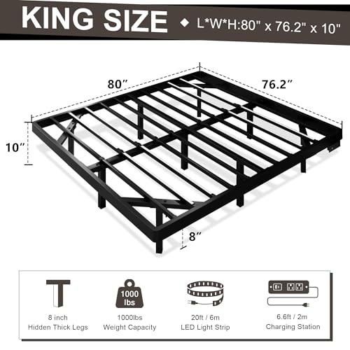 Size Floating Bed Frame with Charging Station and Led Lights, Metal Bed King