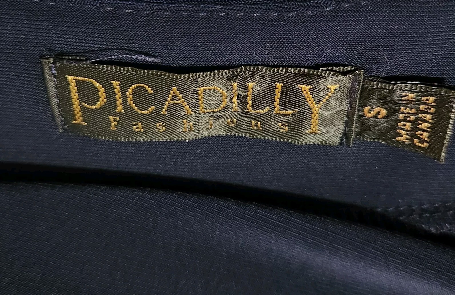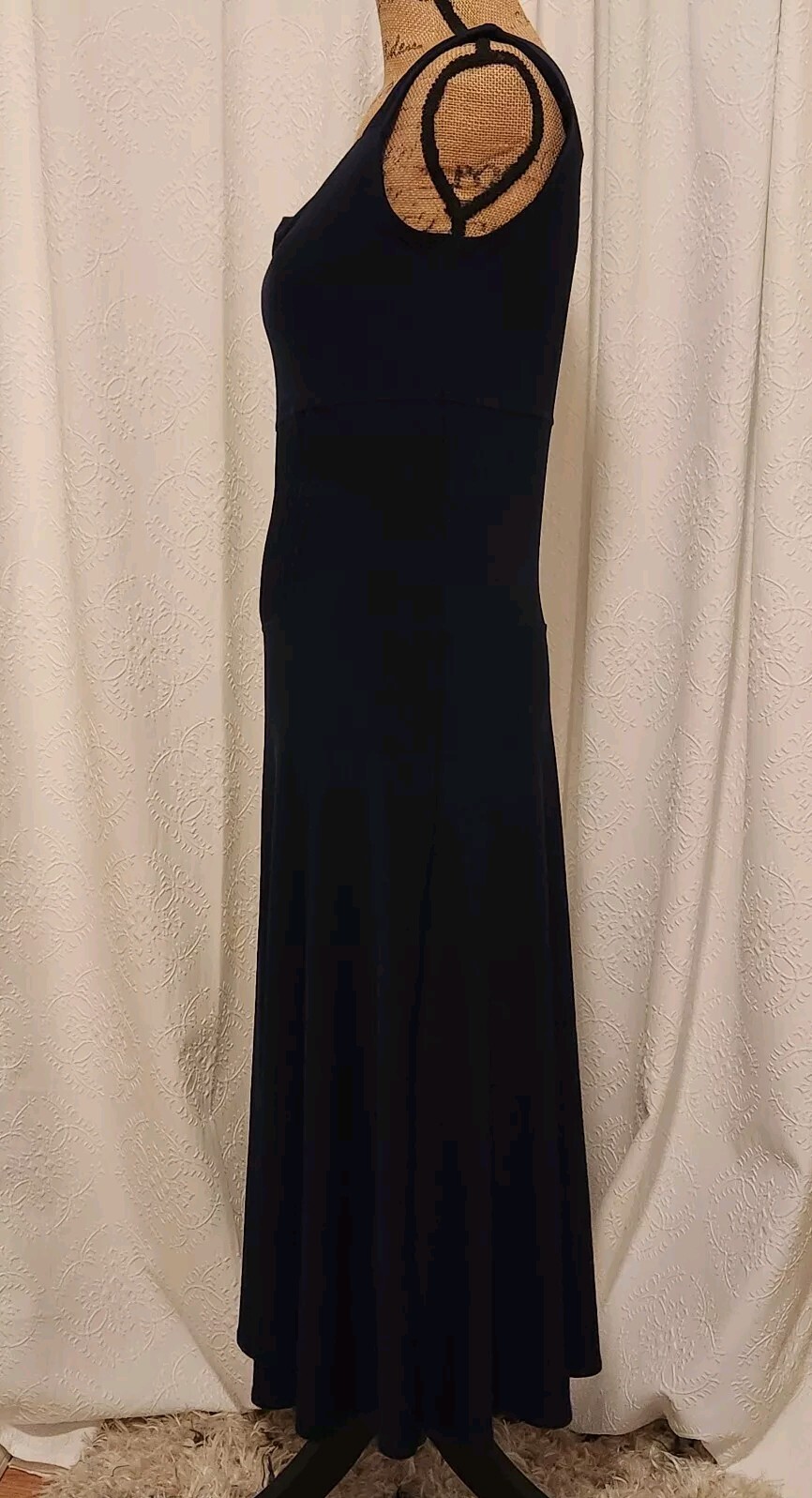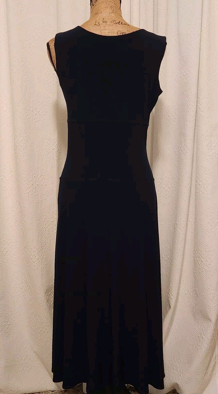 Cowl neckline with pleated shoulders and flattering pleated waistline in front. Stretchy for a comfortable fit. The bust measures 37", the waist is 31" and the shoulder to hem is 44 1/2". Absolutely gorgeous. Gently worn.