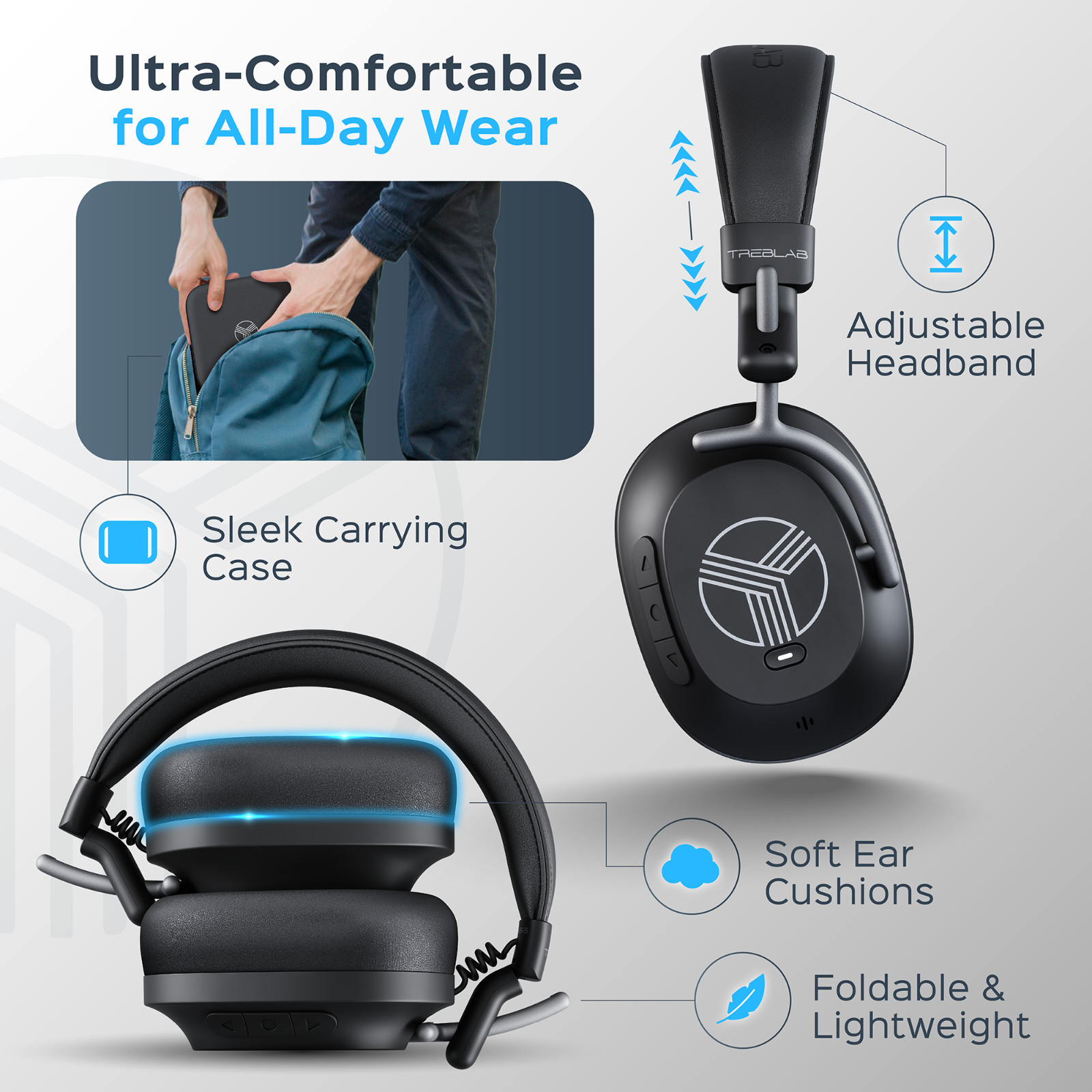 TREBLAB HD77 - Portable Bluetooth Speaker - 30W Stereo, 20H Battery, Waterproof. TREBLAB X4 Wireless Earbuds with Earhooks – 253H Battery, ENC Mic, Bluetooth 5.4. Experience Powerful Sound with TREBLAB U5 ANC Headphones.