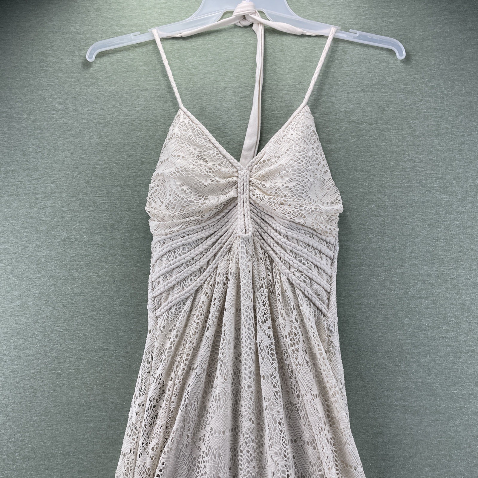 The Vanity Summer Maxi Dress in women's size small is a stunning white crochet lace dress perfect for the summer season. This boho-inspired dress features a halter neck and sleeveless design, making it a stylish and comfortable choice for warm days. The dress is lined for added quality and is recommended for hand wash only to keep it looking its best. Made from polyester with a lace fabric type, this long dress with bohemian theme and brand Vanity is a must-have addition to any summer wardrobe.