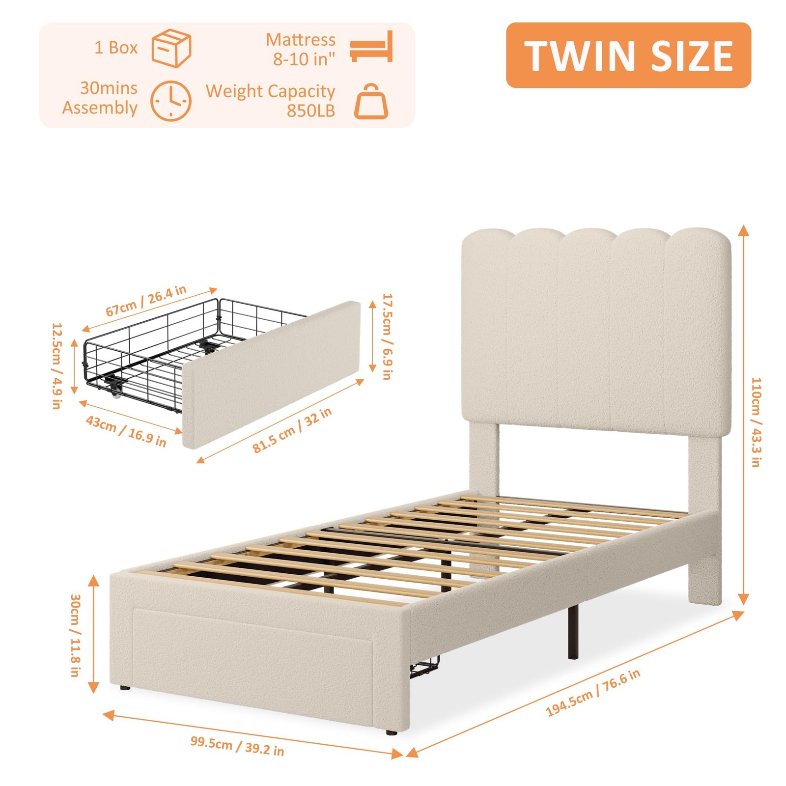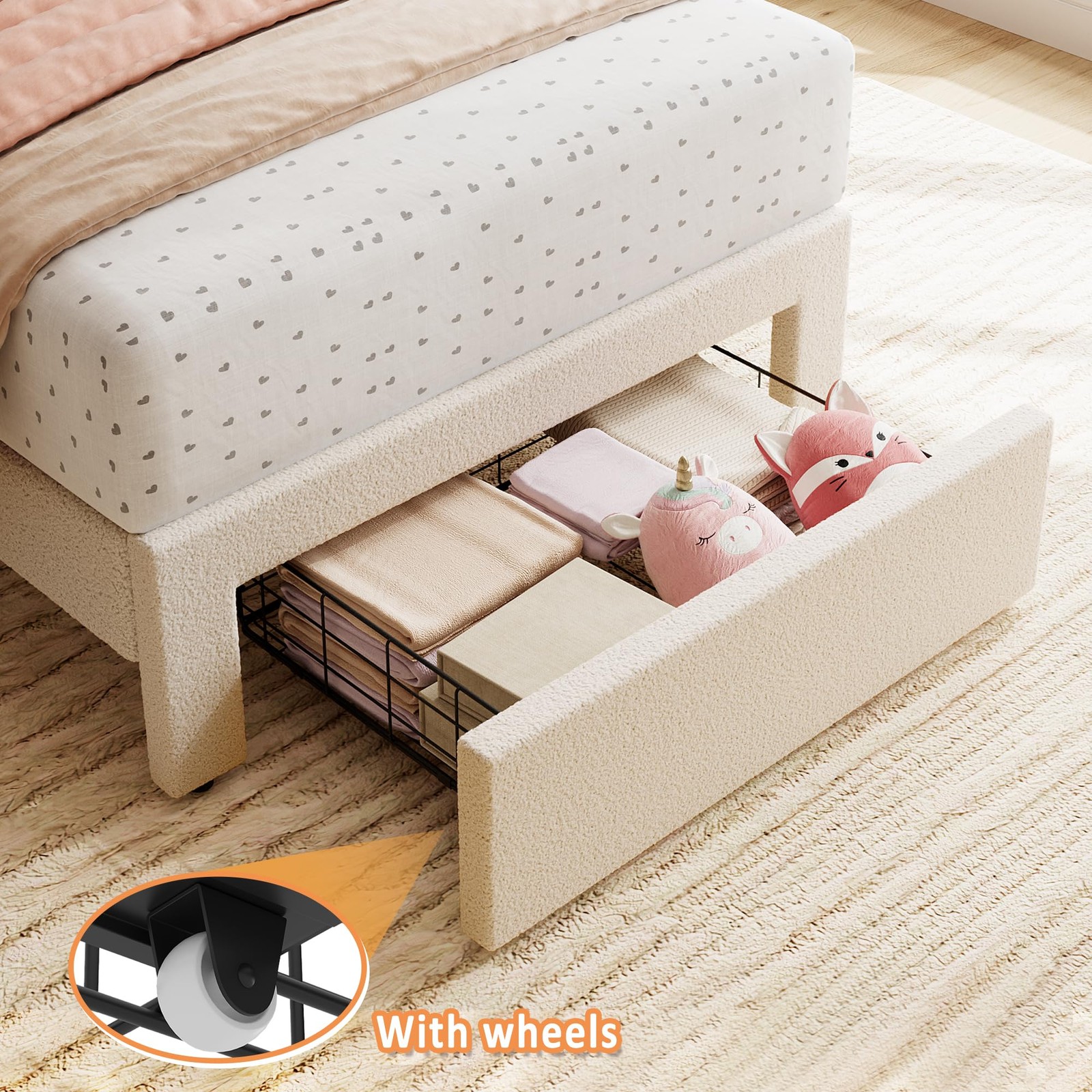 Stylish Design : Features a charming pink boucle upholstery with a unique wave headboard, perfect for kids and girls' bedrooms, adding a cozy and trendy touch. Space-Saving Storage : Includes a convenient under-bed drawer that provides extra storage for toys, clothes, or bedding, keeping the room neat and organized.